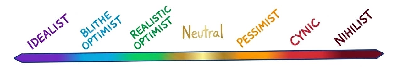 One end of the spectrum is unrealistic when it sees the world as excessively good, and the other end is unrealistic because it sees the world as excessively bad.